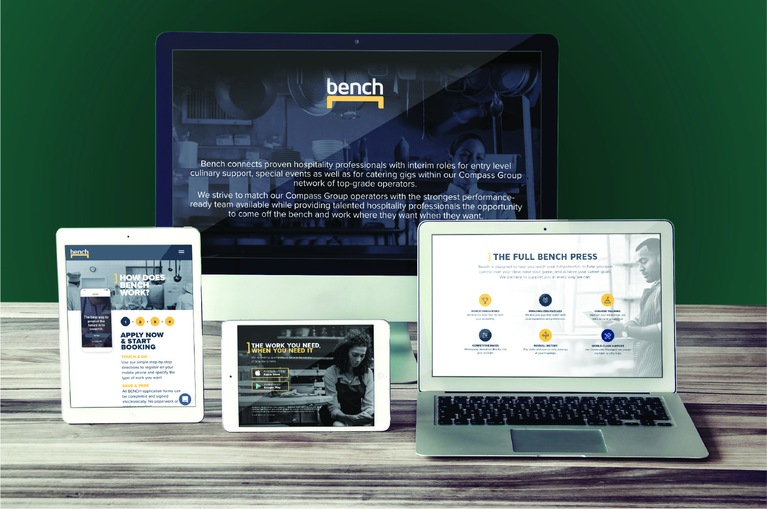 BENCH connects proven hospitality professionals with interim roles for special events and catering gigs within Compass Groups' network of top-grade operators. Point B created a website that encapsulated the new brand and connected hospitality professionals looking for work (Finders) with Compass Group operators looking for experienced staff (Keepers). Thus, in turn, providing operators with the most reliable performance-ready team available and talented hospitality professionals with the opportunity to work where they want, when they want.