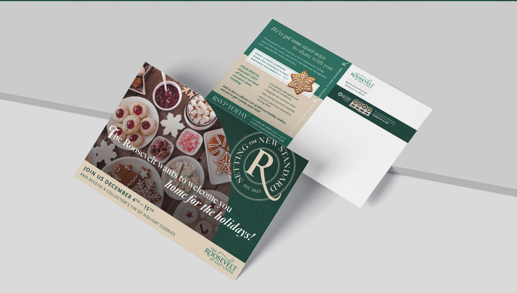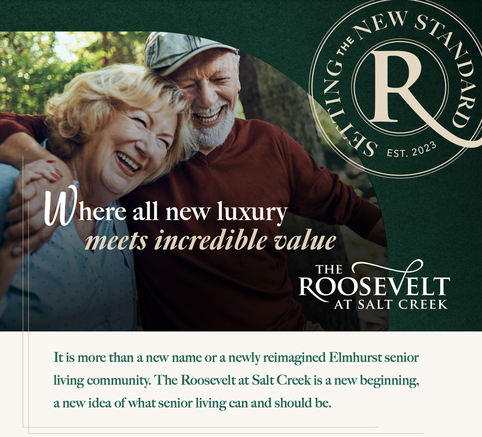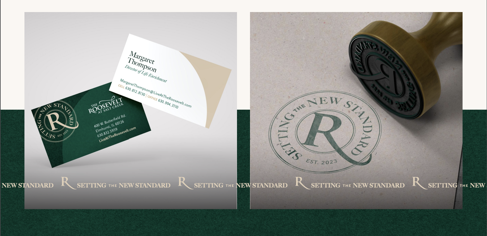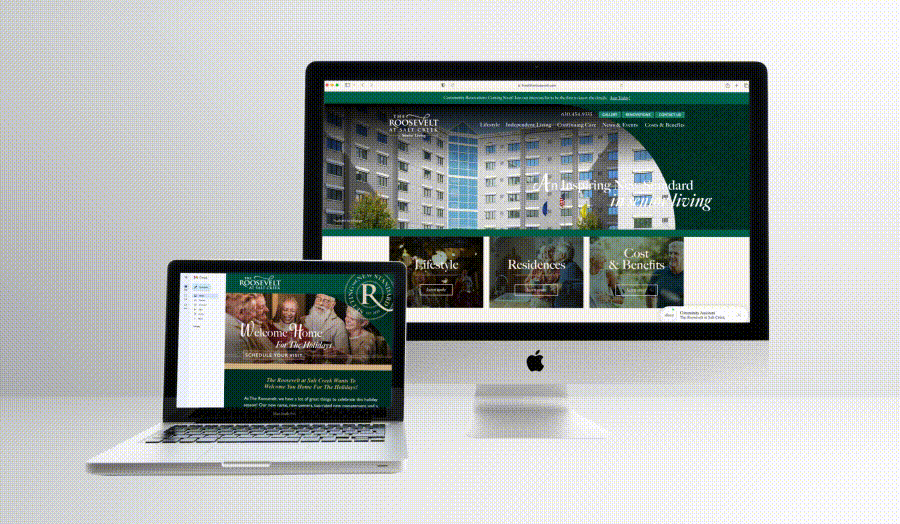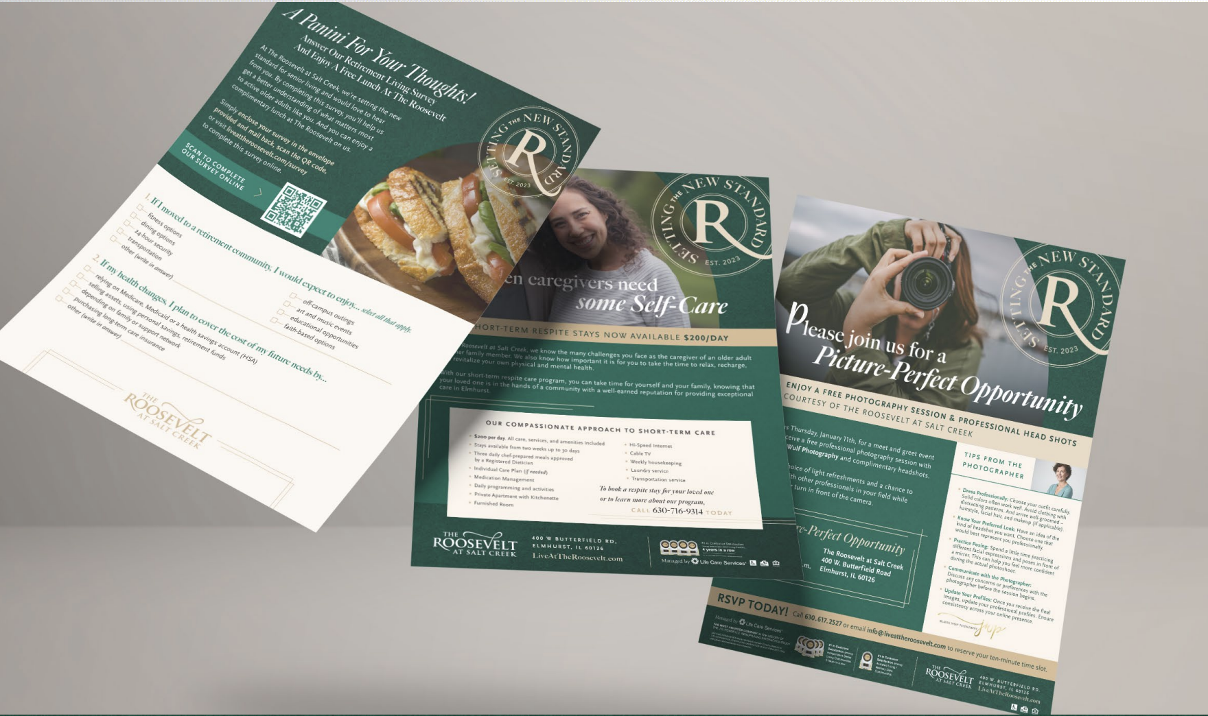 Point B was tasked with helping elevate the community’s reputation into an exceptional senior living community with a lasting impact on the lives of Elmhurst seniors. A new name was developed, based on its location on Roosevelt Road and proximity to Salt Creek, with a new brand to re-introduce the community to the surrounding area and target market. The brand centers upon the unique selling propositions of the renovated community: value, the Elmhurst suburban experience and the renovation itself.