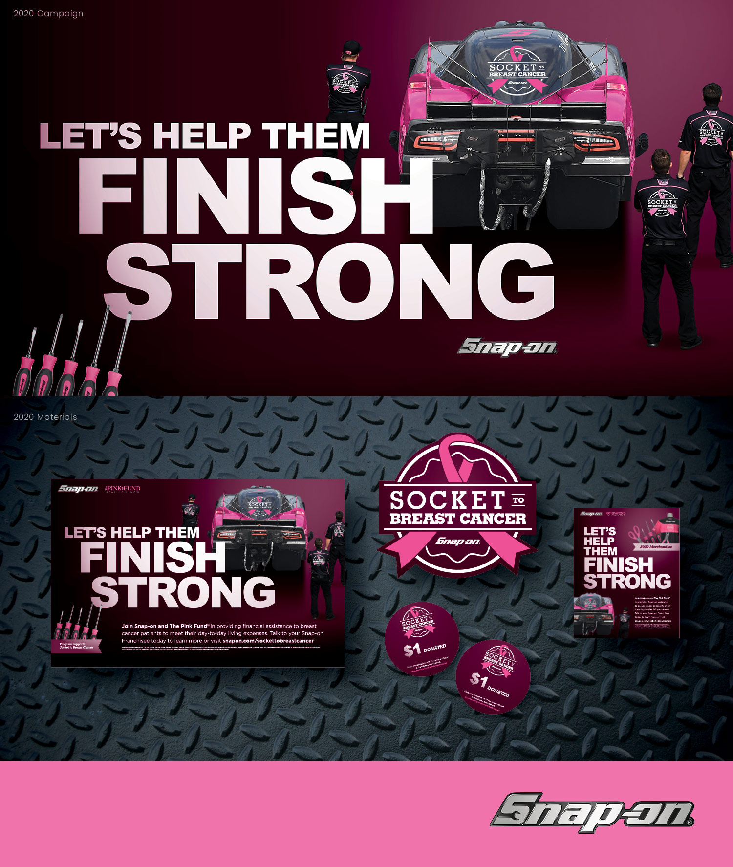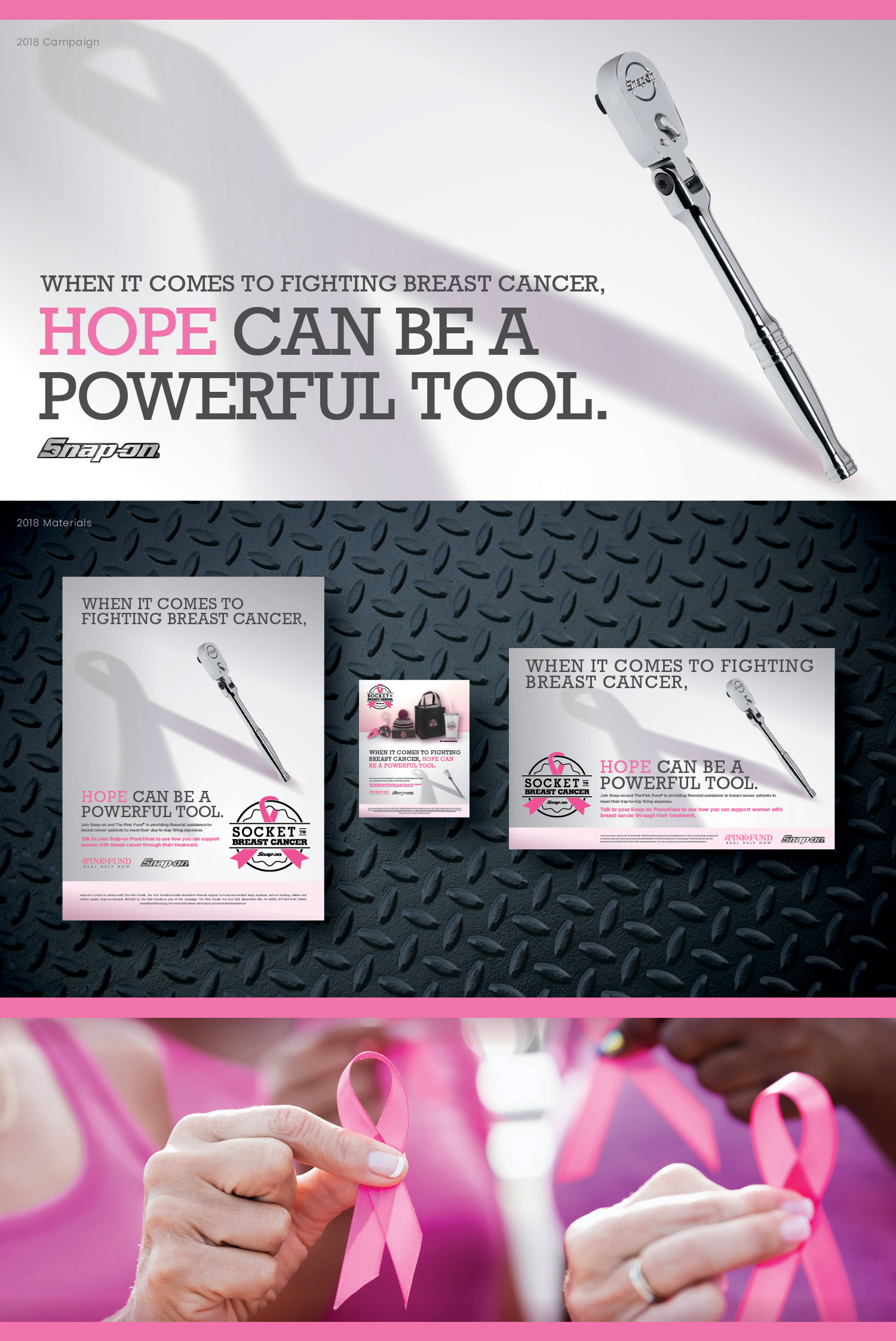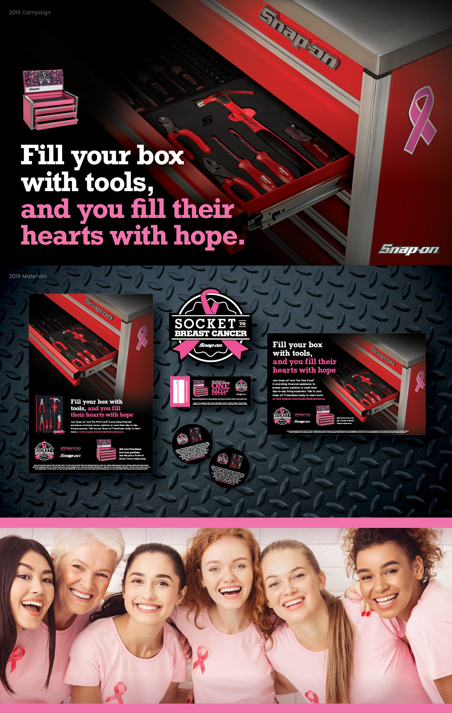 Snap-on, a $3.4 billion global innovator, manufacturer, and marketer of tools, equipment, diagnostics, repair information and systems solutions for professional technicians, wanted to establish an emotional customer connection with their customers. 10% of the proceeds from the sale of select products would be donated to breast cancer survivors. The program featured special packages of the themed product combined with lifestyle premiums that qualify for a donation. They asked Point B to develop a comprehensive franchisee marketing campaign to support the "Socket to Breast Cancer" initiative, including collateral and sales support materials to create awareness, drive increased sales, and push the success of the program to new levels.